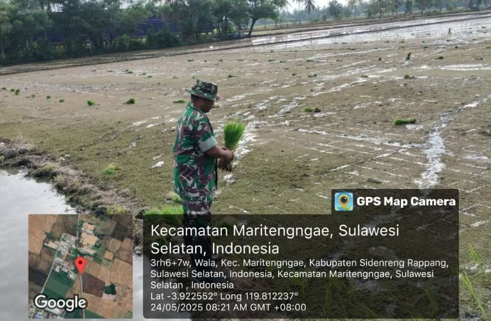 Sidrap, kilatutama.com – Dengan semangat kebersamaan dan pengabdian, Babinsa Kelurahan Wala Koramil 1420-03/Maritengngae, Serka Irwan, turun langsung ke sawah mendampingi petani dari Kelompok Tani (Poktan) Wala Baru dalam kegiatan tanam pindah dan pemantauan Luas Tambah Tanam (LTT), Sabtu (24/5/2025).